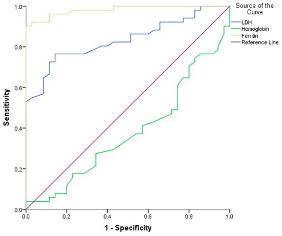 Receiver operating characteristic (ROC) curves of LDH, ferritin, and hemoglobin in diagnosis neonatal sepsis.