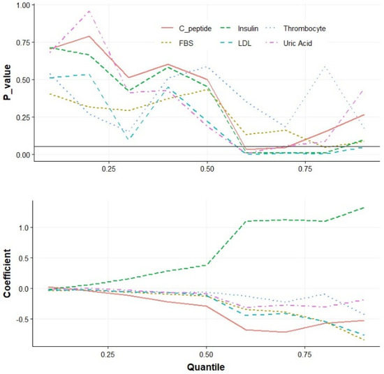 p-values of these variables varied across the quantiles, providing a comprehensive understanding of the statistical significance of their effects. In particular, the thrombocyte values did not exhibit a statistically significant effect across all the quantiles. FBG was negatively and statistically significantly associated with quantiles higher than 0.70 quantile (