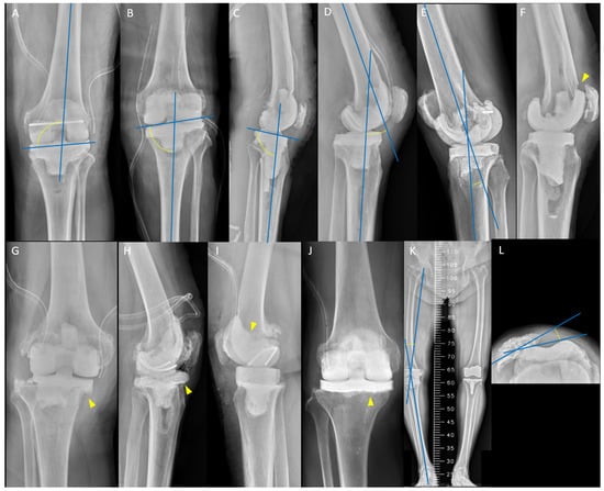 Spacer malalignment was defined as medial distal femoral angle <2° or >8° of valgus [18] (Figure 2A), medial proximal tibial angle (PTA) <−3° or >3° deviation from neutral [19] (Figure 2B), posterior tibial slope angle <0° or >7° of flexion [20] (Figure 2C), flexion contracture >15° of flexion [21] (Figure 2D), and recurvatum deformity >5° of extension [22] (Figure 2E); spacer malposition such as anterior femoral notching >3 mm in depth [23] (Figure 2F), and mediolateral or anteroposterior overhang of tibial spacers >3 mm [24] (Figure 2G,H). Cementing technique of spacers with or without cement stem extension was also recorded (Figure 2I,J). All the above data were measured on anteroposterior and lateral short-leg radiographs obtained 1 week after RA [25]. Lower-limb malalignment was defined as a hip–knee–ankle angle <−10° (severe varus) or >10° (severe valgus) on a scanogram [26] (Figure 2K). Patellar maltracking was defined as a lateral patellar tilt >10° on the Merchant view [27] (Figure 2L). Data were measured separately by the same three physicians, and the mean value was calculated. Mixed outliers were also recorded for each patient.