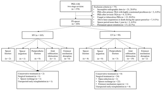 The study was approved by the local institutional review board, and all study participants provided informed consent. The study population was retrospectively derived from a database and included 278 adult patients with chronic PKI, based on the Musculoskeletal Infection Society criteria [13], who underwent a two-stage revision with PS spacers between January 2015 and March 2022, with a minimum follow-up of 1 year. Those with incomplete radiographic data, PKIs after primary TKA with highly constrained prostheses (e.g., NexGen Legacy Constrained Condylar or Rotating Hinge Knees), PKIs after revision TKA, fungal or tuberculous PKIs, above-knee amputation or death during the spacer period, spacer period of more than 1 year, or permanent spacer retention were excluded from the study. Consequently, there were 203 included patients.
