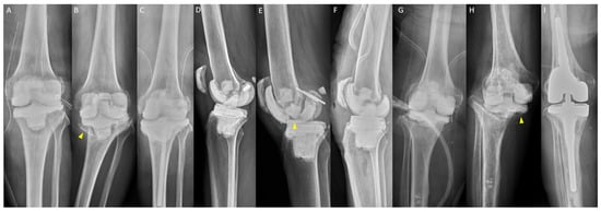 Examples of mechanical complication: (A) a 68-year-old man after resection arthroplasty (RA) with varus malalignment of tibial spacer (medial proximal tibial angle, 83°); (B) periprosthetic tibial fracture (arrowhead) 3 weeks after spacer insertion; (C) reoperation with tibial spacer exchange; (D) a 63-year-old man after RA with recurvatum deformity (12°); (E) femoral spacer fracture (arrowhead) 4 weeks after spacer insertion; (F) reoperation with both spacers exchange; (G) a 76-year-old woman after RA with tibial spacer without cement stem extension; (H) tibial spacer migration (arrowhead) 6 weeks after spacer insertion; and (I) unexpected early reimplantation smoothly.