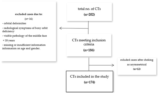 CT data from 186 patients who met the inclusion criteria were imported into the software. In the first phase, the software algorithm compared the orbits of each patient. The orbits were determined to be asymmetric if they differed in volume by more than 0.2 mL. Four men and eight women were identified as having asymmetric orbits. Asymmetric orbits were excluded and analyzed manually (Figure 1).