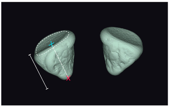 - Surface areas of left- and right-side orbits (meshes): The surface areas of the left- and right-side meshes were calculated as the sum of the areas of the surface elements of the orbit;