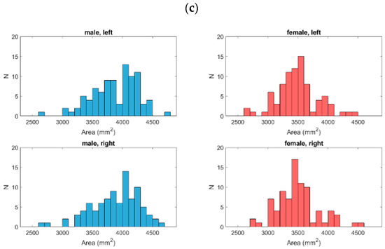 We assessed 174 pairs of orbits (91 men and 83 women). Based on a Shapiro–Wilk test, both the depth and the volume were normally distributed in the male group and in the right orbit of the female group. In addition, the distribution of surface areas for the left orbit of the male group was normally distributed (Figure 3a–c; Table 1).