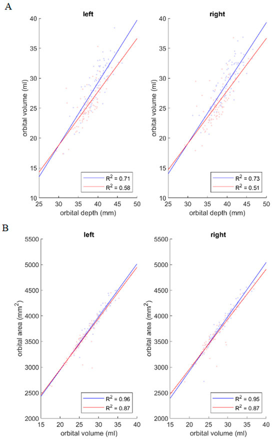 (A) Orbital volume as a function of orbital depth, (B) orbital surface area as a function of orbital volume, and (C) orbital surface area as a function of orbital length. In each pair, a positive correlation was observed between the parameters in both male (blue) and female (red) groups and in both orbits. Correlation coefficients (R2) for each case are reported in the figure.