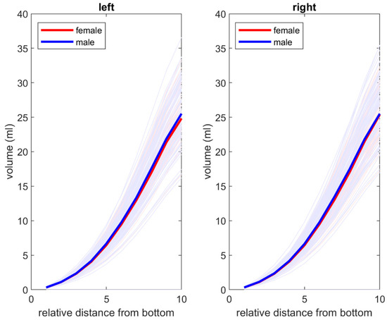 Additionally, an increase in volume as a function of the relative distance from the apex was observed and was similar in men and women. The data are presented in Figure 5.