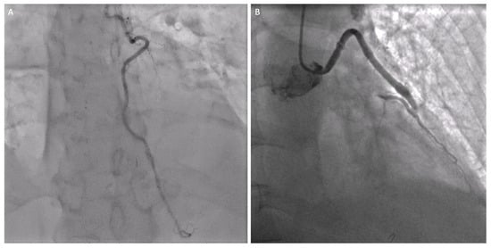 Between February 2013 and December 2023, a total of 1997 patients with coronary artery disease were referred for CABG at our institution. Ninety-two of them (4.6%) were operated on through a left anterior mini-thoracotomy access. In the period from January 2017 to November 2023, 14 patients out of 92 (15%) underwent a hybrid revascularization strategy. Demographic and clinical characteristics of both groups are reported in detail below (Table 1). The intraoperative data are listed in Table 2. After a median follow-up of 75 months (range 3.1:149 months), cardiac mortality was 0% and overall mortality was 3%, with one case of in-hospital mortality (1%), a patient who developed a subarachnoid hemorrhage on the 5th postoperative day, and two additional late deaths. When the conversion rate to sternotomy was analyzed, two cases converted due to the intramyocardial course of the LAD were detected (2.1%). Surgical re-explorations were needed in three patients for bleeding (No bleeding was caused by having the double antiplatelets therapy (DAPT), either in patients receiving single surgical coronary bypass (isolated group) or in patients treated with a hybrid approach (hybrid group) and in two cases for revision due to graft failure (4.6%). Postoperative complications for the total MIDCAB and for the hybrid group are reported in Table 3. All patients received a LIMA to LAD grafting, and in 22 cases (24.2%), one more graft was executed. In the hybrid group, the LIMA has been used as a single graft on the LAD for every patient (Figure 2A), while in two of them, it has also been grafted to the first diagonal branch (Figure 2B). Seventy-nine patients were extubated directly in the operative room (86%) and all patients in the HCR group were extubated directly at the end of surgery (Table 3). Patients in the hybrid group underwent a two-staged PCI revascularizing a mean of 1.6 ± 0.6 vessels (Table 4). In five patients, the procedure was performed during the same hospitalization, while in another three patients, the procedure was scheduled beyond 30 days following the indexed revascularization. The follow-up was conducted until December 2023, and it was 95% complete. The mortality data rate during the follow-up was 100% complete and based on the consultation of the Swiss death bulletin (https://www.todesanzeigenportal.ch, accessed on 1 February 2024).