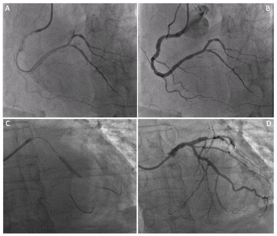 Four panel figure depicting the PCI treatment with stenting of the non-LAD vessels. Panel (A,B): angiographic result after percutaneous revascularization (PCI) with a drug-eluting stent on the distal portion of the right coronary artery. Panel (C,D): angiographic result after percutaneous revascularization (PCI) with a drug-eluting stent at the obtuse marginals’ bifurcation of the circumflex coronary artery.