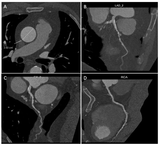 Figure 4. Coronary multislice computed tomography (MSCT) performed before the operation, with the analysis of the ascending aorta (A) and of the three epicardial coronaries (B–D), including the left main. [1] It refers to the calculated diameter of the ascending aorta (white dashed and solid lines).