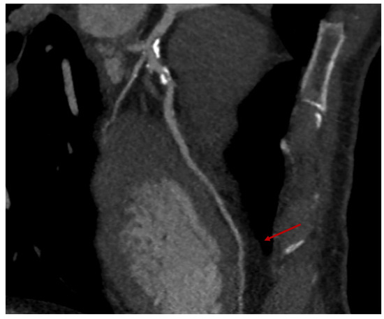 The coronary multislice computed tomography (MSCT), depicting—red arrow—the intramyocardial course of the left anterior descending (LAD), which represents a fundamental exclusion criteria prior to minimally invasive coronary surgery (MIDCAB).