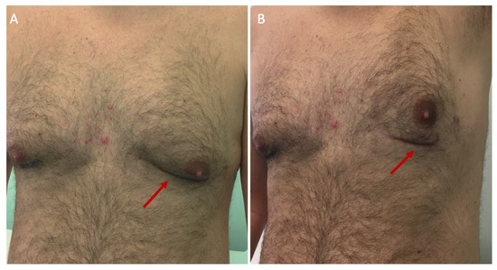 Postoperative cosmetic result after minimally invasive bypass surgery, implanting the left internal mammary artery on the left anterior descending. The reduced scar is visible (red arrows) in the submammary crease with the left arm at rest (A) and with the left arm raised (B).