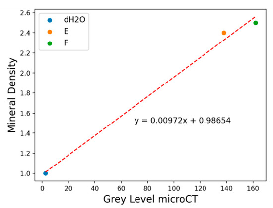 The mineral density (MD) was quantified following the protocol proposed by Schwass et al. [32]. The MD was calculated by the equation MD = 0.00972x + 0.98654 (Figure 1). In order to preserve the grey scale levels and the related MD values, the original cross-section sagittal image was de-noised. The curve (Figure 1) used to convert gray values read in the acquisition into MD values (expressed in g/cm3) was obtained by fitting gray values from three phantoms used for the calibration in the same setting configuration. The phantoms used were as follows: distilled water (1 g/cm3), Herculite XRV Ultra (Kerr, Bolzano, Italy) (2.4 g/cm3), and Premise Flowable (Kerr, Bolzano, Italy) (2.5 g/cm3). Grey values, ranging from 0 to 255, were evaluated using the histogram function in square regions inside each portion (enamel, dentin, and WSL); the analysis was performed on four different slices using Fiji [33]. ORS Dragonfly software Version 2022.1 for Windows (Object Research Systems (ORS) Inc., Montreal, QC, Canada) was used to visualize the 3D reconstruction image and to analyze the different tooth portions (WSL, Enamel, Dentin) [34].
