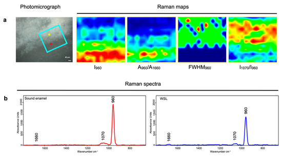 (a) Raman mapping analysis of a representative area at the interface between WLS and sound enamel. Photomicrograph with the mapped area (light blue box, 241.5 µm × 167 µm; yellow and red asterisks indicate the areas with WSL and sound enamel, respectively) and false color images show the topographical distribution of the following spectral parameters: I960 (phosphates), A960/A1660 (Mineral/Matrix), FWHM960 (inversely proportional to Crystallinity), and I1070/I960 (carbonates/phosphates). Different color scales were used for the better interpretation of the data: black/blue color corresponds to the lowest values, and green intermediate and red/dark red to the highest ones. (b) Raman spectra collected on sound enamel (red line) and WLS (blue line) (spectral range 1800–650 cm−1).