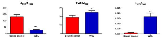 During the carious process, the enamel prisms are submitted to a partial demineralization, generally at the cores, creating gaps in the interrod region [44]. This caused a decrease in the crystallinity of WSL with respect to sound enamel. In this study, only a slight decrease in crystallinity was found in WLSs. Considering that this parameter could be related to the degree of progression in the carious process [45,46], the slight decrease observed in the interface of WLS/sound enamel can allow us to hypothesize that the analyzed lesions represent the initial stage of tooth damage.