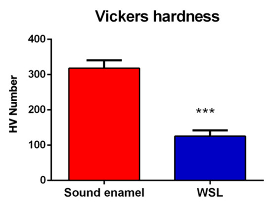 Microhardness values, expressed as the mean HV number (Kg/mm2) ± standard deviation, of sound enamel and enamel with WSL. Statistical significance between groups was evaluated using Student’s t-test. Statistical significance was set at p < 0.05 (***, p < 0.001).