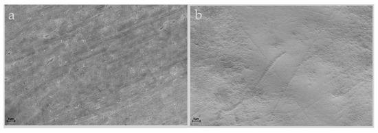 Scanning electron micrographs of sound enamel collected at 2000× (a) and 8000× (b) magnification, respectively. SEM images show the surface micromorphology of sound enamel with the typical intact regular structure.