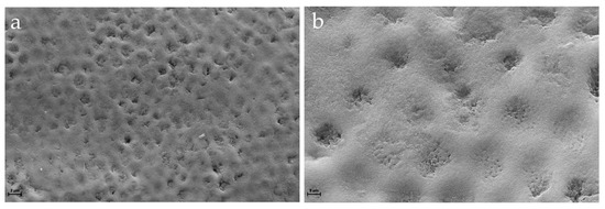 Scanning electron micrographs of a representative WSL collected at 2000× (a) and 8000× (b) magnification, respectively. SEM images highlight the partial dissolution of the apatite crystals showing micropores and irregularities of the demineralized enamel.