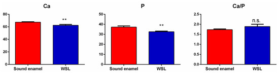 EDX results of Ca (at %), P (at %), and Ca/P ratio of sound enamel and enamel with the WSL. Statistical significance among groups was evaluated using Student’s t-test. Statistical significance was set at p < 0.05 (**, p < 0.01; n.s.: non-statistically significant).