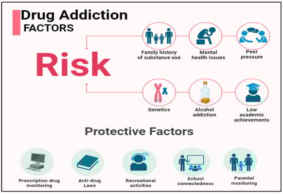 Protective and risk factors associated with drug addiction among individuals. https://app.biorender.com/illustrations/65c9bf623838038a35e0a3a6?slideId=212350a7-bd36-4a9a-baa9-8e46347669a1 (accessed on 5 January 2024).