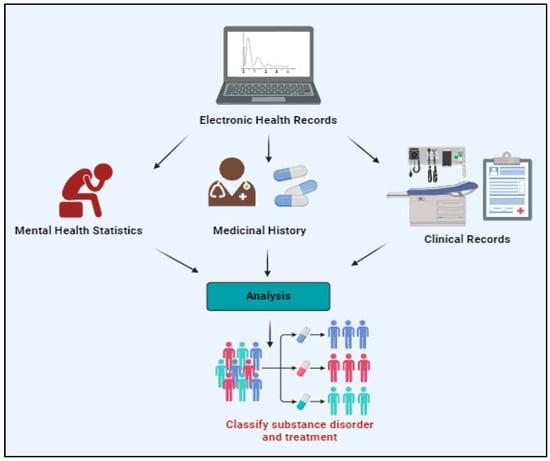 Role of electronic health records in the management and treatment of drug addiction. https://app.biorender.com/illustrations/65c9d39fe1ecacdd7c66b249 (accessed on 5 January 2024).