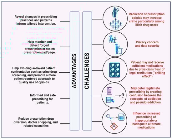 Advantages and challenges related to the use of a prescription drug monitoring system in controlling prescribing addictive medications. https://app.biorender.com/illustrations/65c9d4930b30aa000ee90ce5?slideId=7e85bb6c-29d1-44fe-a542-a5fb3b97cb51 (accessed on 5 January 2024).