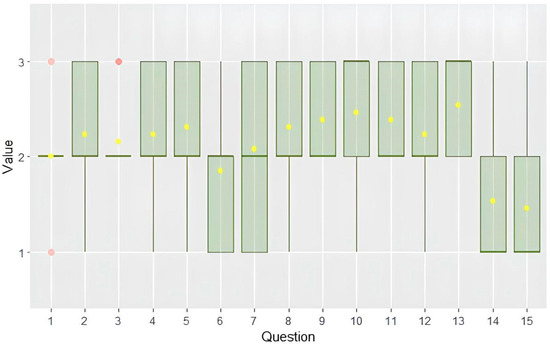 Box plot showing the distribution of comprehensibility scores. Graph shows interquartile range (box), median (horizontal line), mean (yellow dot) and outliers (whiskers).