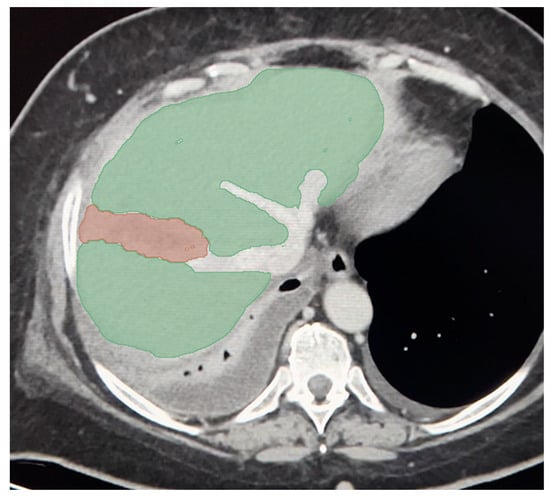 Even if the standard CT exam provides both an arterial and portal phase, in that study, the model was built only on the portal phase. The study was divided into liver segmentation and injury segmentation. As a ground truth, the damaged area and the entire parenchyma were manually segmented.