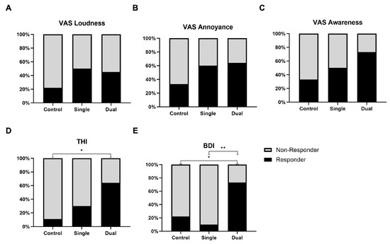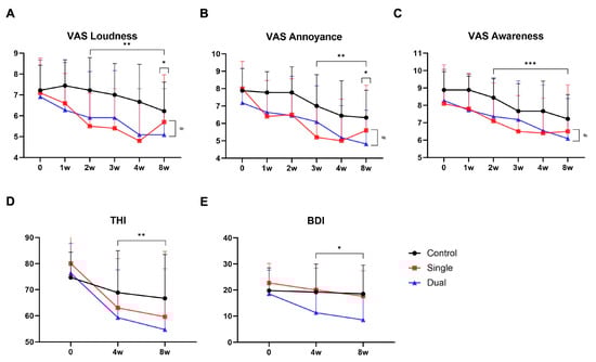 3.2. Change in VAS, THI, and BDI Score after Treatment