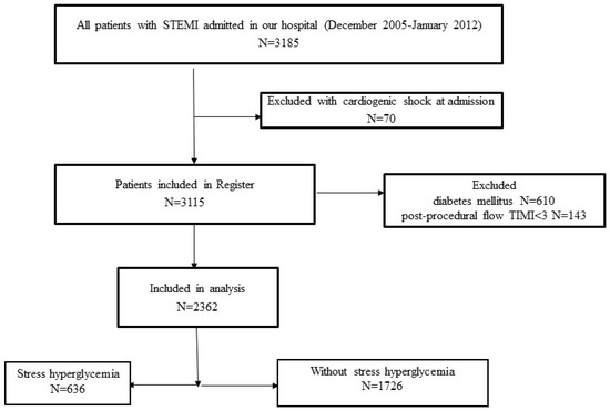 Patients with cardiogenic shock at admission were excluded from the Register. For the purpose of this study, we excluded (1) patients with DM—patients with previous DM (according to medical history, patients on current antidiabetic therapy), as well as patients with new-onset DM diagnosed during hospitalization—and (2) patients with postprocedural TIMI 0, 1, and 2 flow through the infarct-related artery (IRA). The flowchart of patient selection is presented in Figure 1.