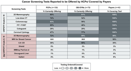 HCPs reported offering breast, cervical, colorectal, and lung cancer screening tests most commonly, which are the indications with grade A or B ratings by USPSTF. In addition, HCPs reported frequently offering cancer screening tests that are typically reimbursed by payers. These tests either have very low costs (e.g., cancer antigen (CA)-125), or have strong evidence of clinical utility data and are on track to receive grade A/B ratings in the future (e.g., 3D mammography and breast MRI). There is limited HCP familiarity and payer coverage of marketed blood-based cancer screening tests (Figure 1).