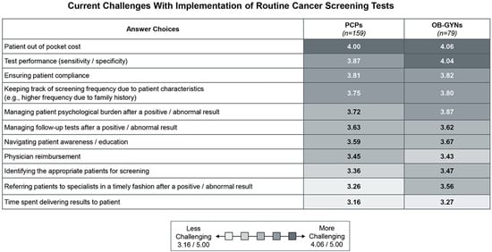Current challenges with implementation of routine cancer screening tests. When asked to rate the current challenges with the implementation of routine cancer screening where 1 is not challenging and 5 is very challenging: primary care providers rated all answer choices provided between 3.16–4.00, and OB-GYNs rated all answer choices provided between 3.27–4.06. Both HCP types rated patient out-of-pocket cost as the most challenging aspect to implementation today.