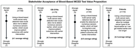 Stakeholder acceptance of blood-based MCED test value proposition. When asked to rate if the respondent agrees with the following statements (see figure for verbatim statement presented to each stakeholder), on a scale of 1 to 5, where 1 is strongly disagree and 5 is strongly agree, the average rating across all stakeholders was >4, indicating strong agreement with the value proposition of MCED tests.