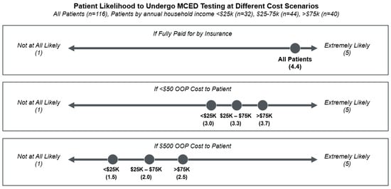 When factoring in the potential OOP cost, patients’ likelihood of choosing to undergo a blood-based MCED test decreased as a function of cost and socio-economic status (Figure 4). The patient survey illustrated that if MCED testing was fully paid for by insurance, patients are most likely to choose the test (rated 4.4/5), and as out-of-pocket cost increases, the likelihood to choose the tests decreases in all patients, with the largest decrease in patients with an annual household income < $25,000 (Figure 4).