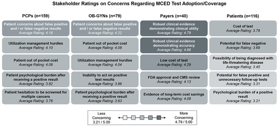 HCPs, both primary care providers and OB-GYNs, rated patient concerns about false positive and/or false negative results, payer utilization management policy challenges, and patient OOP costs as the top three concerns when intending to adopt MCED tests. Patients rated the cost of the test, the potential for false negatives, and the possibility of being diagnosed with a life-threatening disease as their top three issues impeding their use of blood-based MCED tests. Payers reported that robust clinical evidence demonstrating accuracy and utility is the most important factor needed to extend coverage to MCED tests. All survey answer choices were rated >3.0/5.0, suggesting that all of the anticipated concerns to overcome for MCED test adoption may have high impact (Figure 5). When assessing how stakeholders view the significance of the anticipated barriers, payers considered the barriers as the most significant.