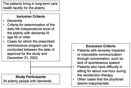This study enrolled 34 older adults with dementia who were residing at the Long-Term Care Health Facility for the Elderly. The participants included 15 males and 19 females, with a mean age of 87.88 years (SD 7.66). Eligibility criteria for the study included a diagnosis of dementia, specifically stage III dementia as classified by the Ministry of Health, Labour and Welfare guidelines, which describe symptoms and behaviors that interfere with daily life and occasional difficulty in communication, requiring nursing care [14]. All participants were aged 65 years or older and were admitted to the dementia ward because they could not be cared for at home. Exclusion criteria included patients with severely impaired communication abilities, those unable to sit for approximately one hour, and other cases deemed inappropriate by the attending physician (Figure 1).