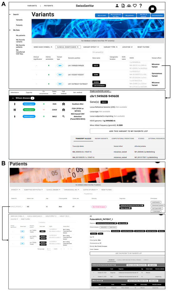 We developed a graphical user interface to visualize and query the data, enabling the users to explore genetic variants in a gene and/or patient of interest or to retrieve patients with specific phenotypic features. Queries can be issued either from a variant or a patient query page (Figure 4). This interface allows for the creation of a custom query based on the user’s interest, with one or multiple criterion filters to search the database and display all the variants or patients matching the selected filtering criteria. The query result is displayed in a variant or patient results table, respectively, showing only the selected information items that can be compared or searched for. However, once a specific variant or patient has been selected by clicking on the corresponding row of a results table, the user can access the individual detailed page providing more granular information about the variant or the patient of interest. Thus, the detailed variant page includes a table of all the patients harboring that specific variant along with selected related information, as well as automatically retrieved variant annotations, as described in Table 1. The detailed patient page contains a table of variants detected in the patient of interest (obtained from the VCF files) and provides various phenotypic features. If no filter is used, the variant and patient tables list all the variants of interest by default and patients present in the database. The “Uploaded patients” and “Transferred VCF files” pages, which are accessible via the “My Data” selection panel or menu at the top of the interface, assist users in managing their own data and provide an overview of their submitted patients and transferred VCF files, including their (validation) status. On the individual detailed patient page, the clinical partner of the submitting institution can complement the patient entry with a standardized dataset of non-identifying clinical and demographic information and add the granular history of medical contacts with the clinical/phenotypic findings obtained and potential genetic diagnoses. In addition, the data provider can prioritize clinically (potentially) significant variants by flagging them as “of interest” (by clicking on the asterisk icon on the left side of the variant table), which can likewise be completed directly on the detailed page of the respective submitted VCF file. Finally, the application offers the possibility to add variants and patients to the user’s favorites list under the individual detailed page. A notification system will be established to inform the users of any changes or updates to their variants or patients of interest.