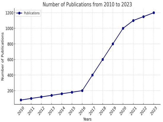 Number of publications related to artificial intelligence in cardiology from 2010 to 2023—adapted from [9].