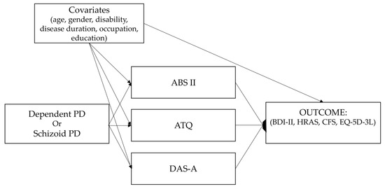 To test the mediation effect of dysfunctional psychological mechanisms on the relationship between personality disorder and outcome variables, we estimated eight mediation models using manifest variables—one for each of the two PDs and combined with one of the four dependent variables (i.e., anxiety, depression, fatigue, and health status). Thus, each model included: (1) one personality disorder; (2) three mediators; and (3) one dependent variable at a time. To further control for the particularities of the sample and obtained unbiased estimates, we used the same covariates as in the multiple regression models. The hypothetical mediation model applied to each variable is presented in Figure 1. The mediation analyses were performed using the package lavaan version 0.6 [57] in R version 4.3.3 [54].