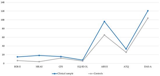 The results of comparisons between the two groups are presented for anxiety, depression, fatigue, health status, and dysfunctional psychological mechanisms are presented in Table 2. The table presents group means and standard deviations together with results from Welch’s t-test and Cohen’s d measure for effect size. All data presented had a normal distribution, falling in the −2–+2 interval for skewness and −7–+7 for kurtosis. In general, the clinical sample had larger means than the controls for depression (t = −4.05, p = 0.00, d = 0.91), anxiety (t = −6.34, p = 0.00, d = 1.45), NATs (t = −2.64, p = 0.01, d = 0.61), IBs (t = −2.91, p = 0.00, d = 0.67), fatigue (t = −2.44, p = 0.02, d = 0.55), and health status (t = −6.38, p = 0.00, d = 1.42), with the exception of DAs, which was only marginally significant (t = −1.96, p = 0.05, d = 0.45). Between-group comparisons are presented in graphical form in Figure 2.