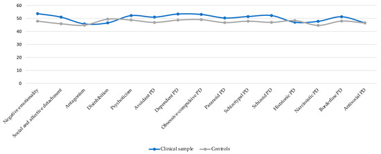 In Table 3 are presented comparisons of PCF pathological personality dimensions and accentuated personality traits between the clinical sample and controls using Welch’s t-test. The variables were normally distributed in both groups. The two groups were different only in some personality dimensions, with the majority of results being unsignificant. Thus, in the clinical sample, negative emotionality (t = −2.54, p = 0.01, d = 0.60) and social and affective detachment as personality dimensions (t = −2.64, p = 0.01, d = 0.61) scored higher. As for personality disorders, dependent (t = −2.15, p = 0.04, d = 0.51) and schizoid (t = −2.64, p = 0.01, d = 0.61) personality traits (PTs) were observed in comparison with controls. Between-group comparison are presented in graphical form in Figure 3.