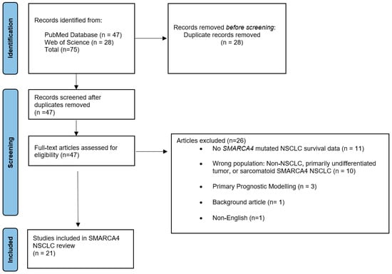 In this critical review, 75 articles were identified by applying the search strategy. Twenty-eight articles were excluded and removed as duplicate records, and 47 articles were fully reviewed. Twenty-six articles were excluded due to the lack of SMARCA4-mutation NSCLC survival outcomes, primary prognostic modeling, lack of incorrect patient population (i.e., sarcomatoid histology), review articles, and being written in non-English.