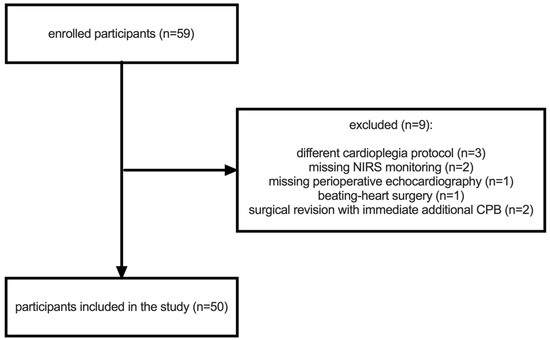 This observational clinical pilot study was approved by the Ethics Committee of the Medical Faculty of Heidelberg (Trial-Code no. S-246/2019) and was conducted in accordance with the principles of the Declaration of Helsinki and Good Clinical Practice. Written informed consent was obtained from the patients or their legal guardians. A total of 59 patients who were scheduled for elective coronary artery bypass grafting (CABG) surgery were screened for eligibility between May and July 2019. Inclusion criteria were: age ≥ 18 years, elective bypass surgery, and the capacity to provide informed consent. Exclusion criteria included: preoperative hemoglobin < 10 g/dL, hematocrit < 30%, preoperative end-stage renal disease (requiring renal replacement therapy), prior coronary artery bypass surgery, use of a cardioplegia solution other than Brettschneider, non-consent to data collection, expanded procedures including valve or aortic surgery, and off-pump coronary artery bypass (OPCAB) or “beating-heart” surgery. Nine patients were excluded from the study, three of whom were excluded due to receiving a different cardioplegia protocol: intermittent antegrade warm cardioplegia protocol (Figure 1).