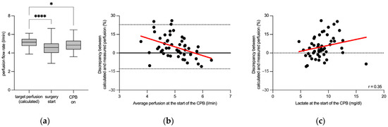 Differences between the calculated and measured perfusion flow rates. The box plots in panel (a) show the target perfusion flow rate (calculated before the procedure), cardiac output measured echocardiographically at the start of the surgery (surgery start), and the initial perfusion flow rate measured at the start of cardiopulmonary bypass (CPB on). Panel (b) features a Bland–Altman plot that highlights how the discrepancy between the calculated target and the measured perfusion flow rate at the start of CPB varies with changes in the pump flow rate, plotted against the average perfusion rate at this key time point. Panel (c) shows a correlation analysis between the discrepancy in calculated and measured perfusion flows and the lactate concentration at the start of CPB, underscoring the relationship between perfusion adequacy and metabolic response. In the box plots of panel (a), central lines signify median values, boxes indicate quartiles, and whiskers represent minimum and maximum values. The black dots in panels (b,c) represent individual data points, with the red line indicating the best-fit linear regression. The dotted lines in panel (b) depict the 95% limits of agreement. * p < 0.05; **** p < 0.0001 (Friedman test followed by Dunn’s multiple comparison test); r: Spearman’s correlation coefficient.