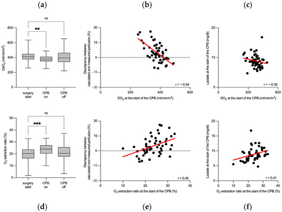 Perioperative oxygen transport fluctuations correlate with differences in flow rate sensitivity between calculated and measured perfusion rates. The box plots in panel (a) depict changes in oxygen delivery during cardiopulmonary bypass. Panel (b) plots the observed changes in the oxygen delivery at the start of cardiopulmonary bypass against the magnitude of the discrepancy between the calculated and actual measured perfusion flow rates at this time point. A scatter plot in panel (c) represents correlation analysis between oxygen delivery and the lactate concentration at the start of the cardiopulmonary bypass. The box plots in panel (d) show changes in the oxygen extraction ratio during cardiopulmonary bypass. Changes in the oxygen extraction ratio observed at the start of cardiopulmonary bypass are plotted against the magnitude of the discrepancy between the calculated and measured perfusion flow rates at this time point (e). Correlation analysis between oxygen extraction ratio and the lactate concentration at the start of the cardiopulmonary bypass is shown in panel (f). Central lines in the box plots indicate median values, boxes denote quartiles, and whiskers represent minimum and maximum values. Black dots represent individual measurements. The best-fit linear regression line is presented in red. DO2: oxygen delivery; CPB: cardiopulmonary bypass; ns: not significant; ** p < 0.01; *** p < 0.001 (repeated measures ANOVA followed by Dunnett’s multiple comparison test); r: Spearman’s correlation coefficient.