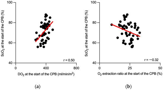 Correlations between cerebral oxygen saturation and oxygen transport parameters at the start of cardiopulmonary bypass. Scatter plots represent the correlation analysis between cerebral oxygen saturation and oxygen delivery (a) and the oxygen extraction ratio (b), measured at the start of cardiopulmonary bypass. Black dots represent individual measurements. The best-fit linear regression line is presented in red. ScO2: cerebral oxygen saturation; DO2: oxygen delivery; CPB: cardiopulmonary bypass; r: Spearman’s correlation coefficient.