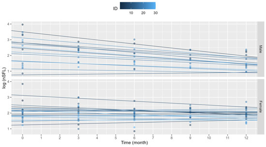 This study included 30 PwMS with forms of relapsing–remitting MS (RRMS) who had received OCR treatment for at least 12 months. At the onset of OCR treatment (baseline), the mean age was 40.8 ± 10.5 years, the mean BMI was 24.5 ± 3.81 (n = 21), and 57% were female; male and female participants did not significantly differ in sNfL levels (16.9 vs. 9.46 pg/mL, respectively; p = 0.368).