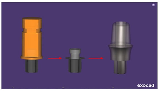 The CAD design of each Bredent Sky-compatible dental implant abutment (Figure 4) was made using the specialized software Exocad DentalCAD 3.2 Elefsina, obtaining a Bredent Sky-compatible dental implant abutment with a platform diameter of 4 mm, a height of the emergence profile of 3.5 mm, and a slightly concave-convergent profile.