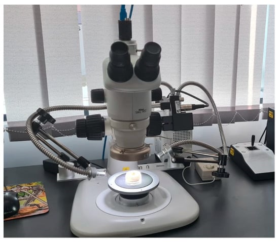 The surface evaluation of the studied prosthetic abutments was performed by microscopic analysis using the Nikon SMZ745T stereomicroscope (Figure 8), which is recommended for industrial and biomedical applications. It has a magnification of 75× and a working distance of 115 mm, which allows optimal visualization of processing traces on study samples. Real-time EDF (Extended Depth of Field) was used to capture high-resolution images.