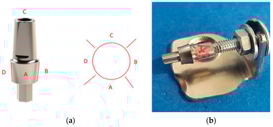 For each of the dental implant abutments studied, four faces of the surface of the emergence profile were assigned: Surface A, Surface B, Surface C, and Surface D (Figure 9a).