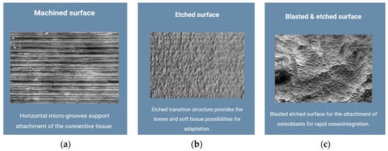 Types of surfaces produced by Bredent Group: (a) machined surface; (b) etched surface; (c) blasted and etched surface.